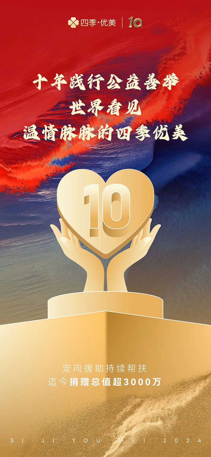 一幀幀記憶連綴,便成了歲月沉淀的況味:十年的貼地飛行,盡管無法避免摩擦感,但向前、向美、向善始終是我們的主旋律。這一刻,是作別,也是啟程,伴隨著深情的回眸,耳畔依然是篤定的鏗鏘足音:站在新的起跑點上,四季優(yōu)美將繼續(xù)攜信念行走山海,以奮斗回應時代。歷經歲月打磨的四季優(yōu)美將以更自信、更青春、更務實的姿態(tài),與世界同頻共進。